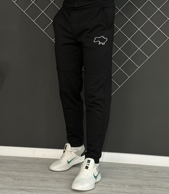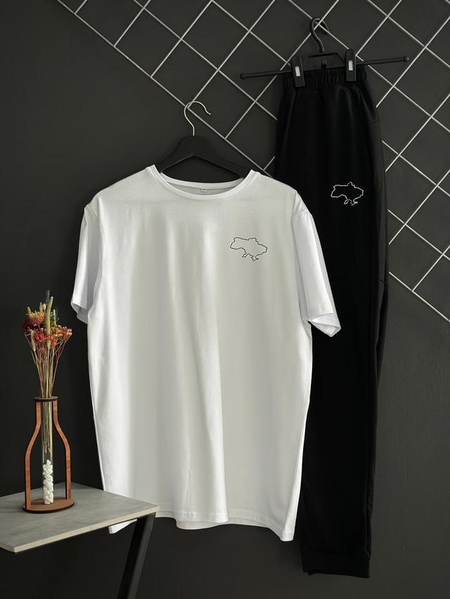 Чоловічий спортивний костюм складається зі штанів і футболки з логотипом мапи України, які поєднують у собі комфорт і стиль. Штани пошиті з тканини двонитки, що робить їх приємними на дотик, а також вирізняються зносостійкістю. Вони мають зручний еластичний пояс із регульованим шнурком, який забезпечує ідеальну посадку на талії. Бічні кишені дають змогу легко зберігати ключі, гаманець і мобільний телефон під час занять спортом.