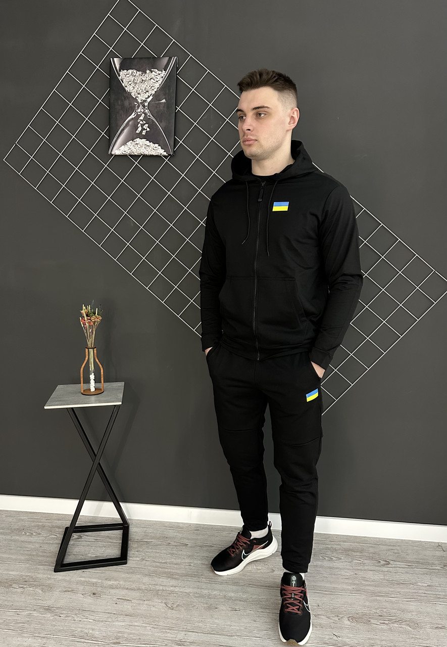Чоловічий спортивний костюм демісезонний з лого Прапор України — це стильний і комфортний комплект для активних людей, які бажають мати модний вигляд будь-якої пори року. Костюм виготовлений у насиченому кольорі та складається з дуже зручної кофти на блискавці з капюшоном і практичних штанів чорного кольору з якісної двонитки.